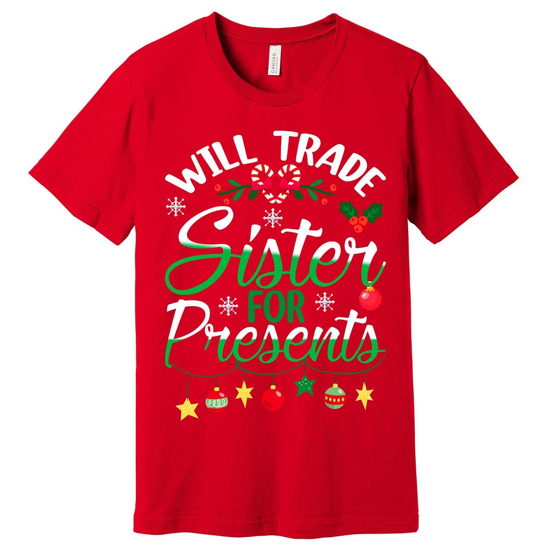 Get ready to spread some holiday cheer with our hilarious and cute custom Christmas sister t-shirt. This festive holiday shirt features a front motif of candy canes, holly, and Christmas ornaments, along with the witty wording, ‘Will trade sister for presents’.